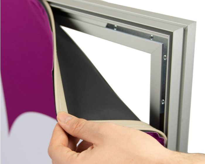 La tension du textile s’effectue grâce à un jonc plat en silicone cousu sur tout le pourtour du visuel. Celui-ci s’insère dans le rail périphérique du cadre et répartit la tension de manière homogène sur l’ensemble de la surface. Une languette textile discrète permet de retirer et remplacer facilement le visuel, sans outil ni fixation supplémentaire.